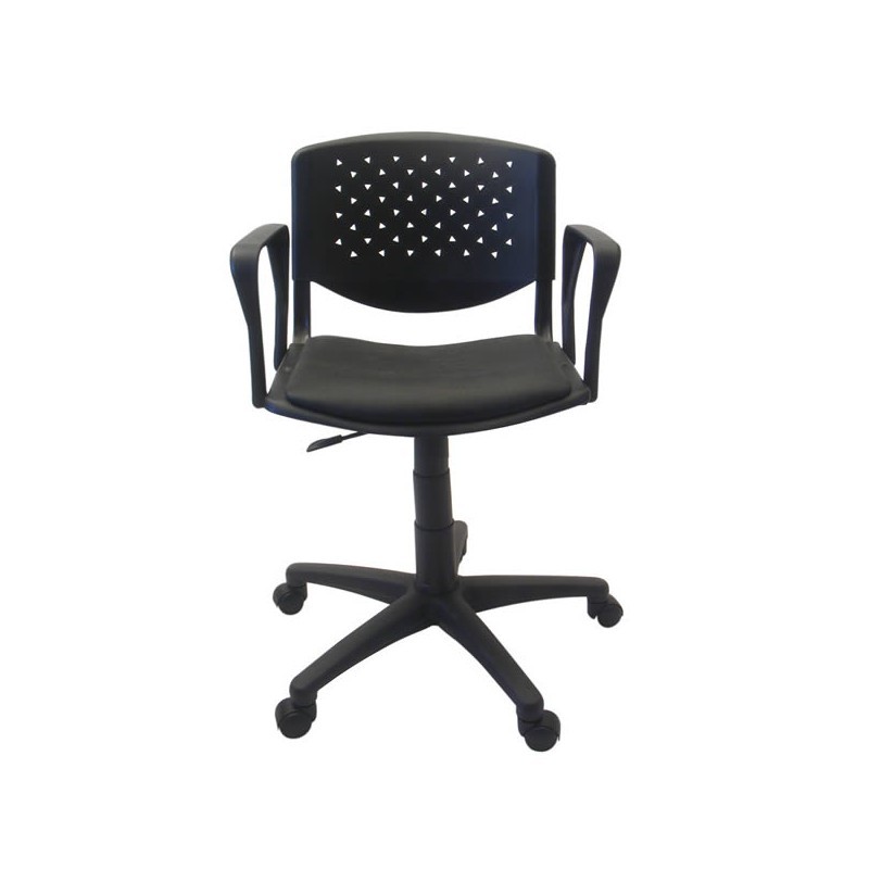 Asiento tapizado en tela o ecocuer. Espuma de alta densidad. Respaldo de homopolí­mero de alto impacto negro. Base compuesta por nylon y fibra de vidrio de alta resistencia. Regulación neumática de altura de asiento. Opcionales: Apoyabrazos / Base cromada / Base plástica con alma de acero / Estructura fija de cuatro patas con o sin apoyabrazos / Kit apoyapies / Kit Pupitre de madera.